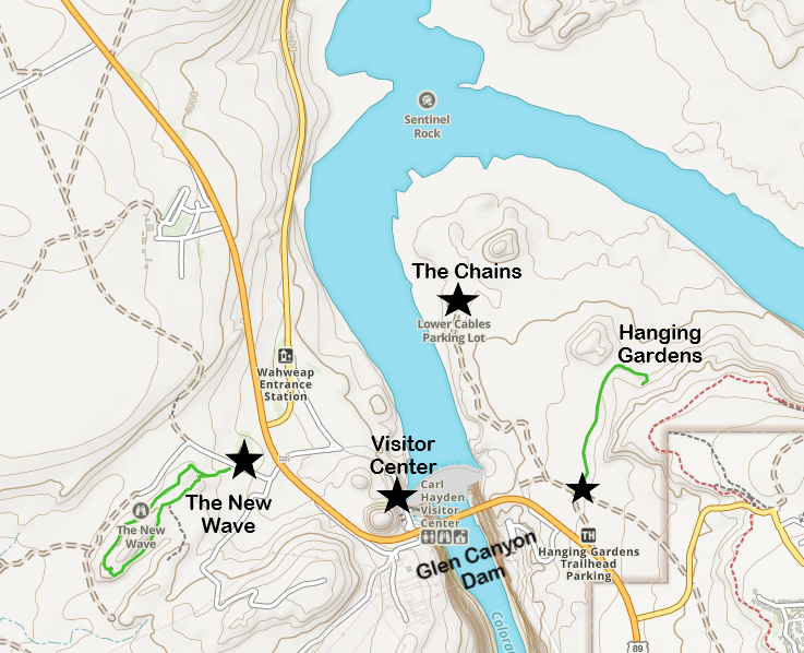 Being honest, in 2019, I tried to find the New Wave, thought I was there, and I’ve since realized I found the Chains…. (see above). Although twice since 2019, we’ve been near Page, we haven’t gone through the city at the right time of day to go hiking. But I have the map of where to find the New Wave provided below. It’s on the west side of the Colorado River, near the turn-off of US-89 to Wahweap Marina.