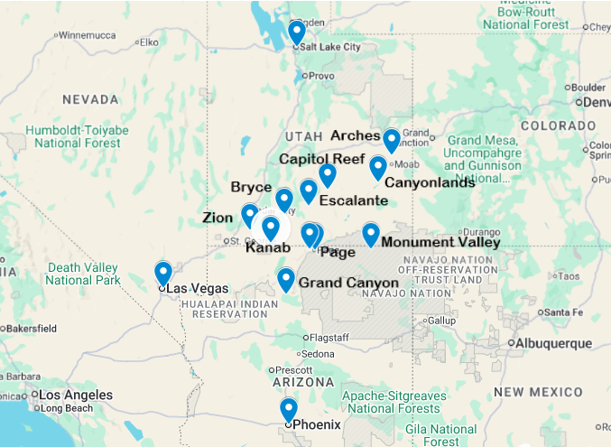 The reason Page remains a quiet town despite some incredible features is that it takes some considerable driving effort to get to it. Below is a map showing where Page is located, as well as cities with international airports, and other National Parks, any of which could be combined into a larger road trip.