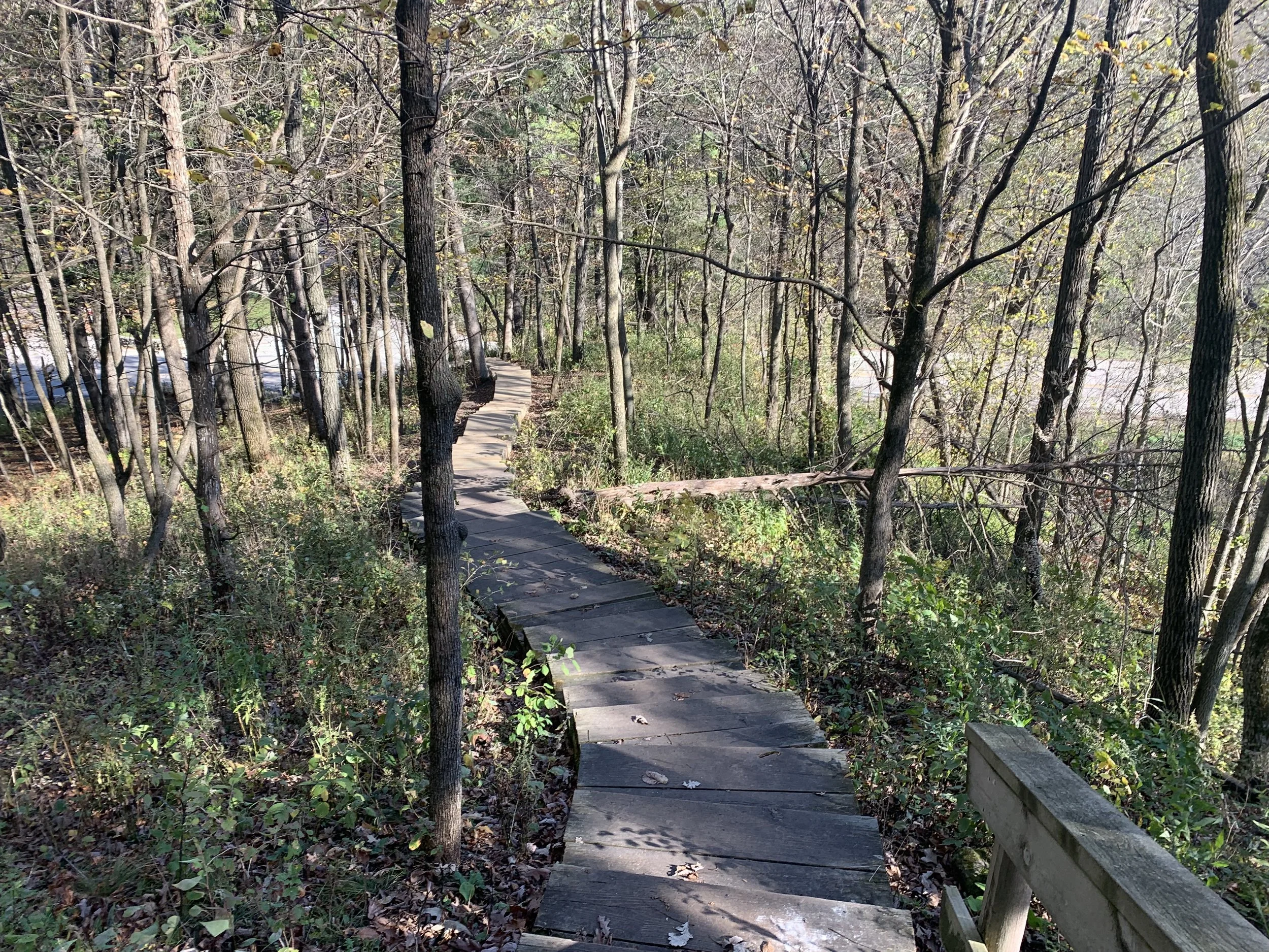 There’s a wonderful beach and small lake (large pond?) to swim in, stones to jump across the river, flat trails that follow the creeks and river, lots and lots of stairs, beautiful views from the bluffs, and a pretty cool rock with holes large enough to squeeze into.