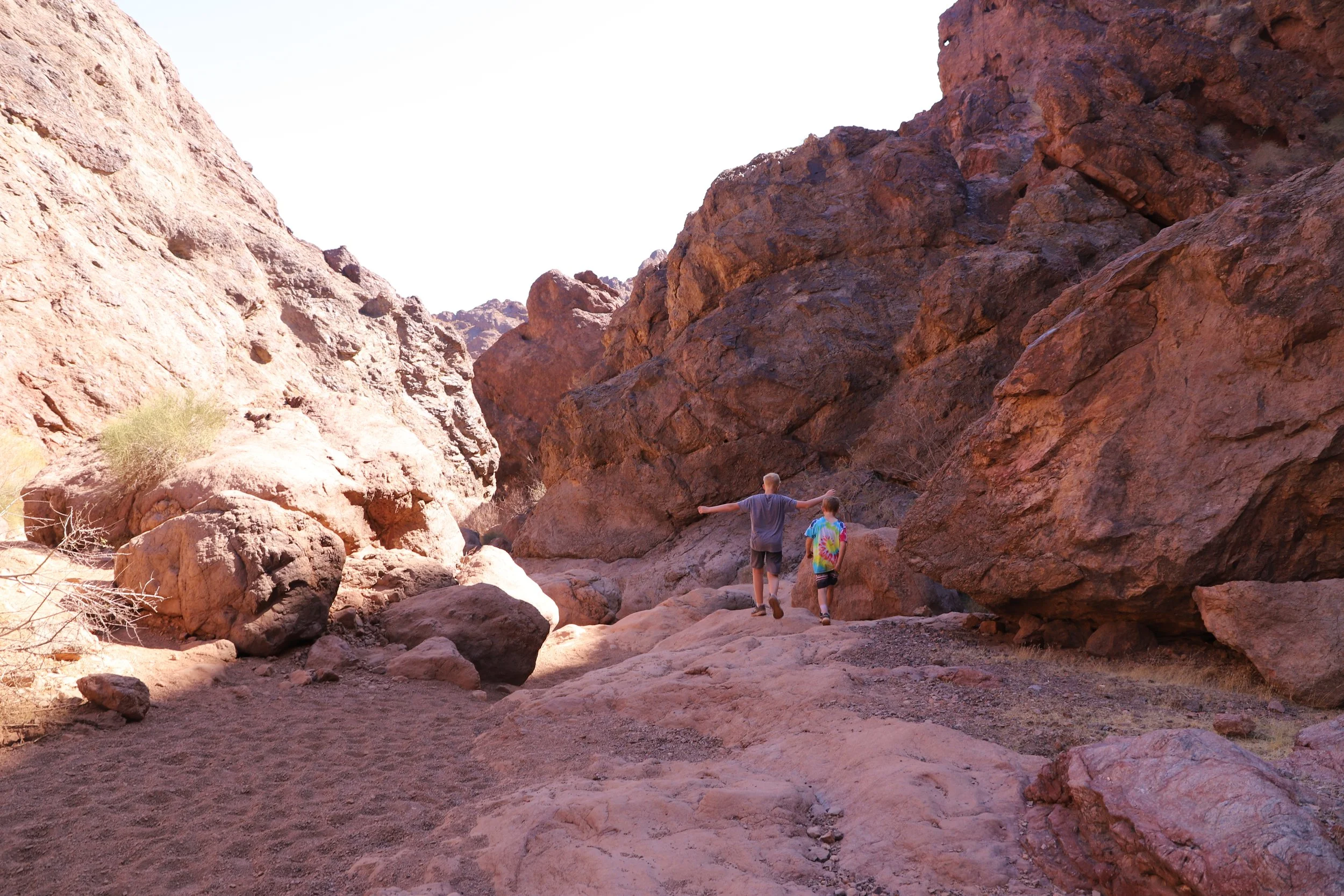 My boys and I hiked Gold Strike during a trip in March 2021. They were aged 8 and 12. Gold Strike was not only our favorite hike on this Spring Break trip, it is still one of our favorite hikes ever. This is what I would call an extreme hike, and it’s important to know what you are getting into if you pick this trail. You will need to use your arms to scamper up and over multiple boulders, and there are several ropes that require quite a bit of upper body strength to navigate over the largest boulders. It wasn’t obvious always how to use the ropes to get around the obstacles, and sometimes we had to try a few different ideas before we figured it out. That’s why we thought this trail was fun; because of these challenges. If you are looking for a hike that only requires your legs, then pick the Arizona Hot Springs.