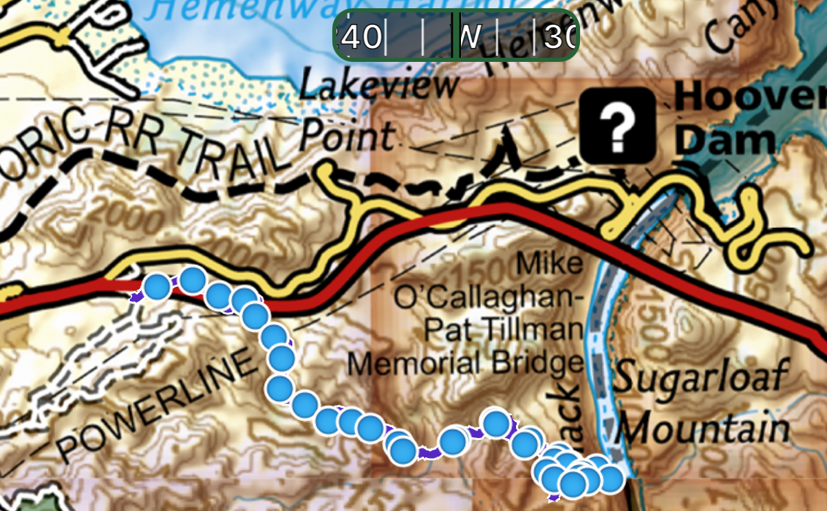 Map from GAIA app of both hot spring trails below the Hoover Dam