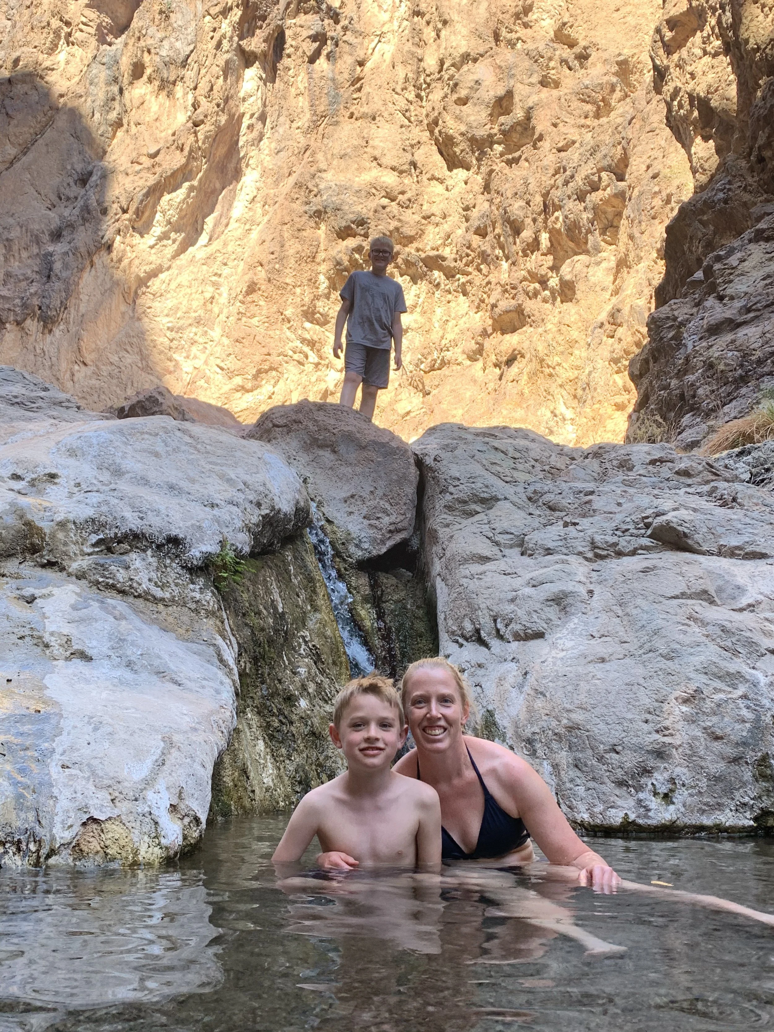 The best part of the White Rock Canyon Trail was the AZ Hot Springs themselves, and I’d rank this hot spring as my favorite hot spring that I’ve found so far. They are wonderfully warm and really deep. If we had more time, I could have soaked for hours. In the picture above, we are standing, and I’m holding my younger son up slightly, so you can get an idea of how deep it is.