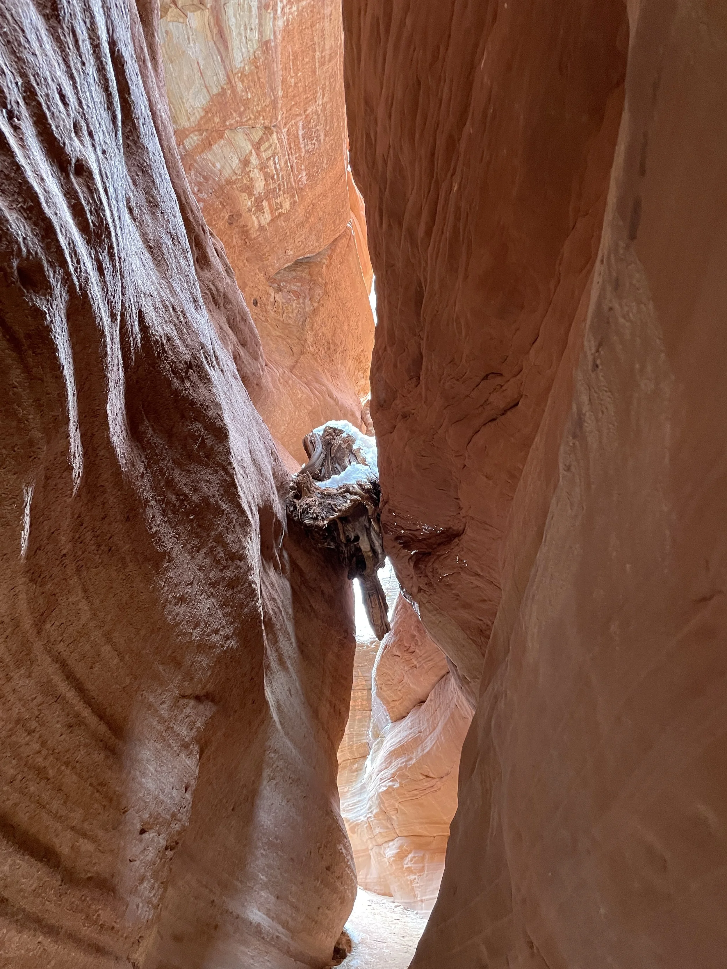 There was a large tree stump wedged quite high up in the canyon walls. It’s not just water that rushes through a canyon when it floods. Everything that water has captured - logs, brush, even boulders, can get swept into the canyon and if large enough, these objects may become lodged in the canyon’s narrow walls.