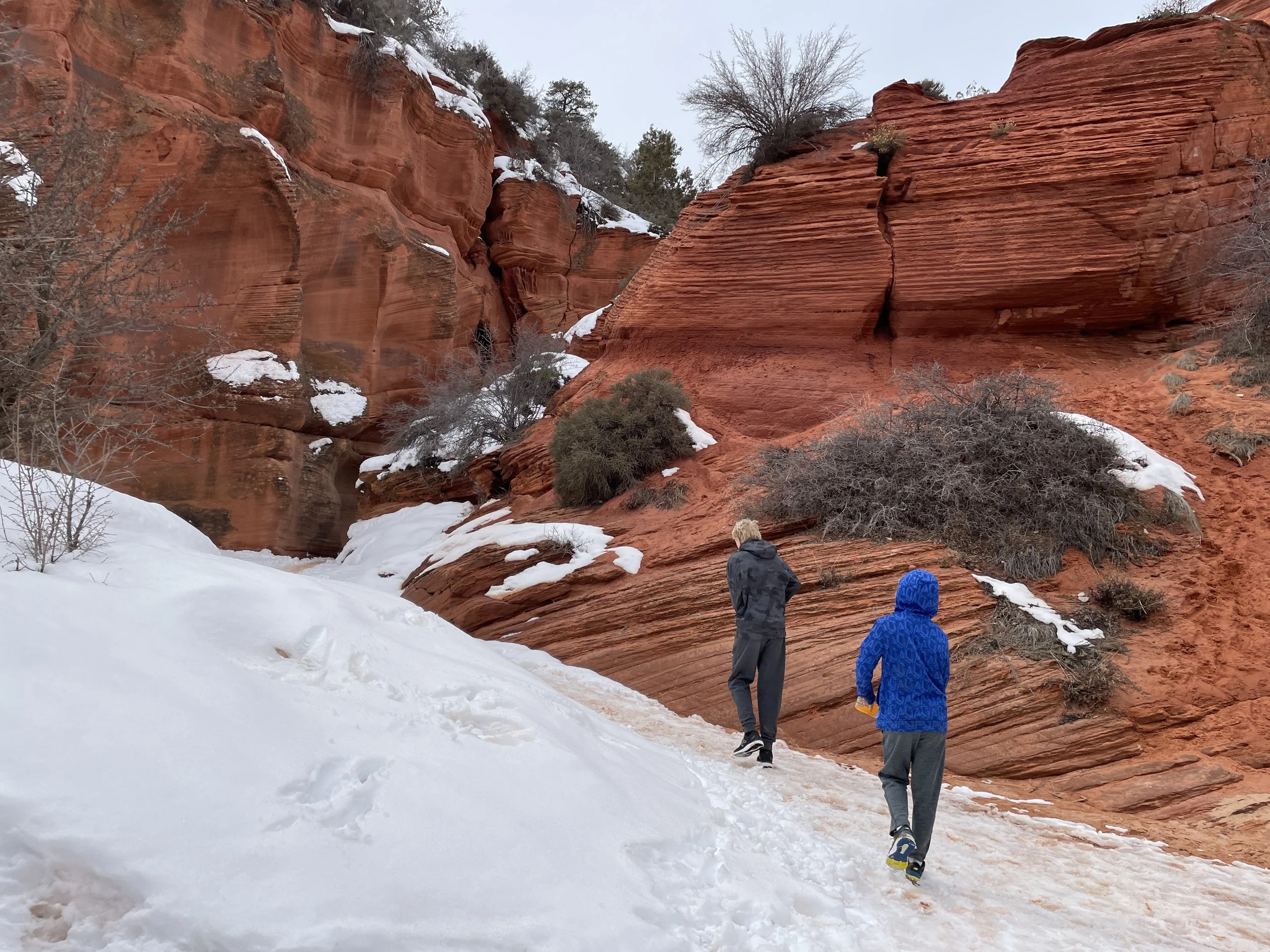Visiting Peekaboo Slot Canyon is free (unless you need to rent a UTV / ATV or hire a guide). The parking lot for off-road vehicles is on the east side of the canyon. Peekaboo Slot Canyon is right next to the parking lot. One-way, this is an easy 0.5 mile sandy (or snowy in our case) hike up a shallow incline. Past the slot canyon, the Red Canyon Trail continues for another 1.4 miles (one-way). The Red Canyon Trail can be accessed from a second spot along the west side of the canyon, but this is going to involve either a 2.2 mile hike with someone driving the off-road vehicle to the opposite side of the canyon to pick you up, or a 4.4 mile round-trip hike. We just hiked the slot canyon portion of the trail out-and-back.