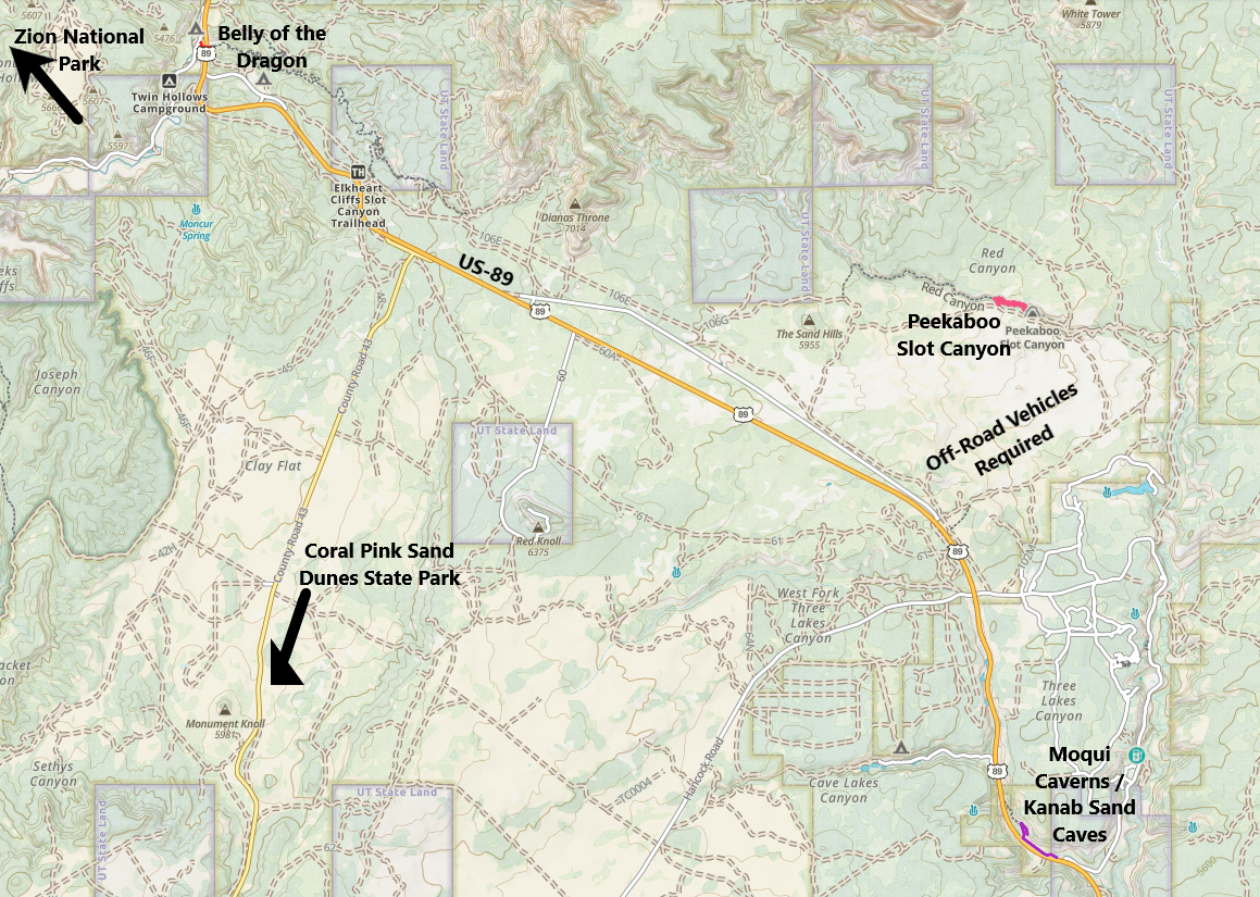 Map of Peekaboo Slot Canyon and other nearby things to do