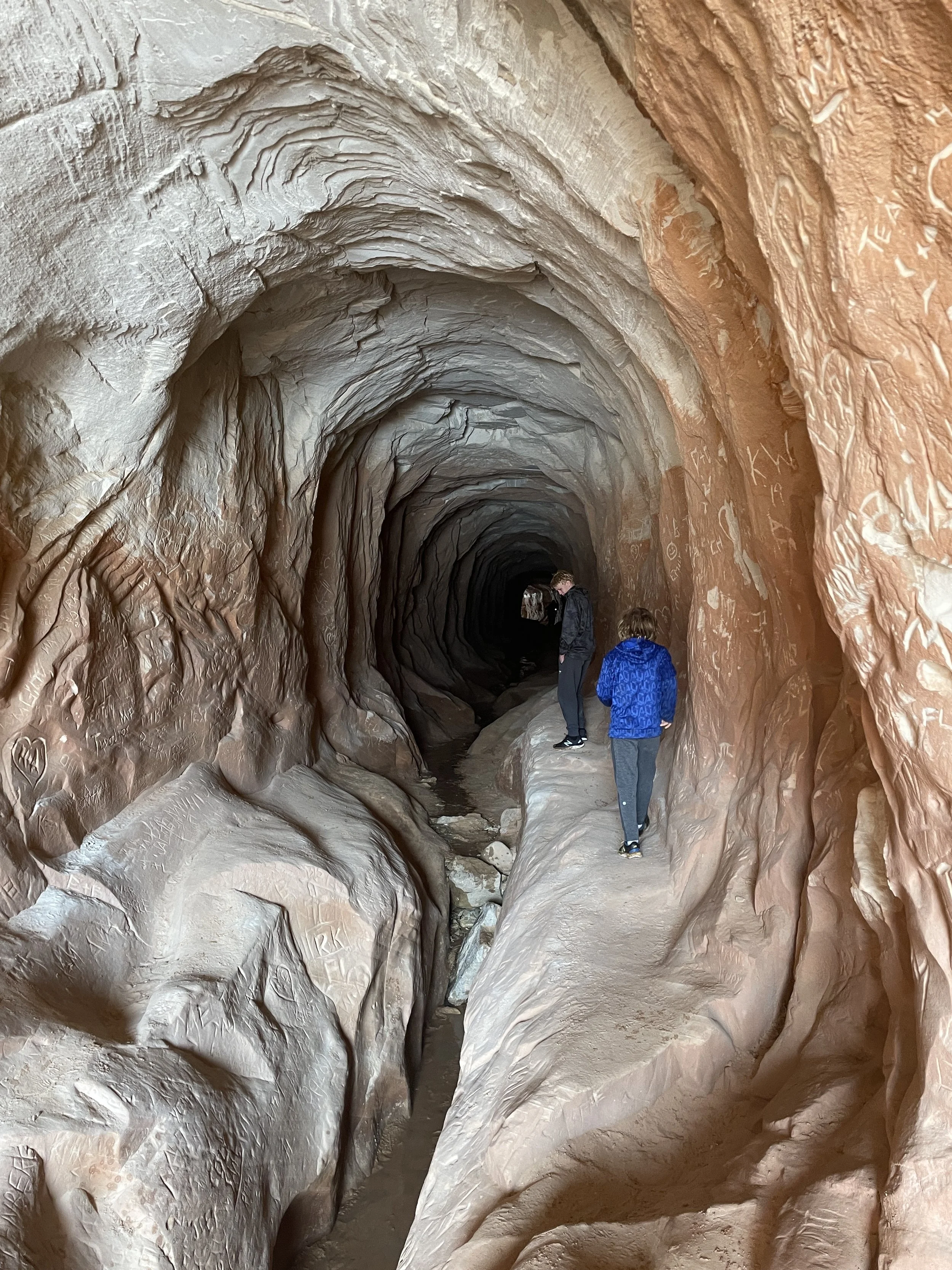 This is a super easy trail. From the trail through the culvert is just 0.1 miles and it’s flat the whole way. Everyone will be able to pear into the Belly of the Dragon. The only accessibility issue might be walking through the culvert. You can see my boys below, walking along the right side. There is a slot canyon forming through the sandstone that I wouldn’t recommend walking through. Stay on the right side. There are some moments where the trail is bumpy and requires a jump or two a descent ways into the culvert.
