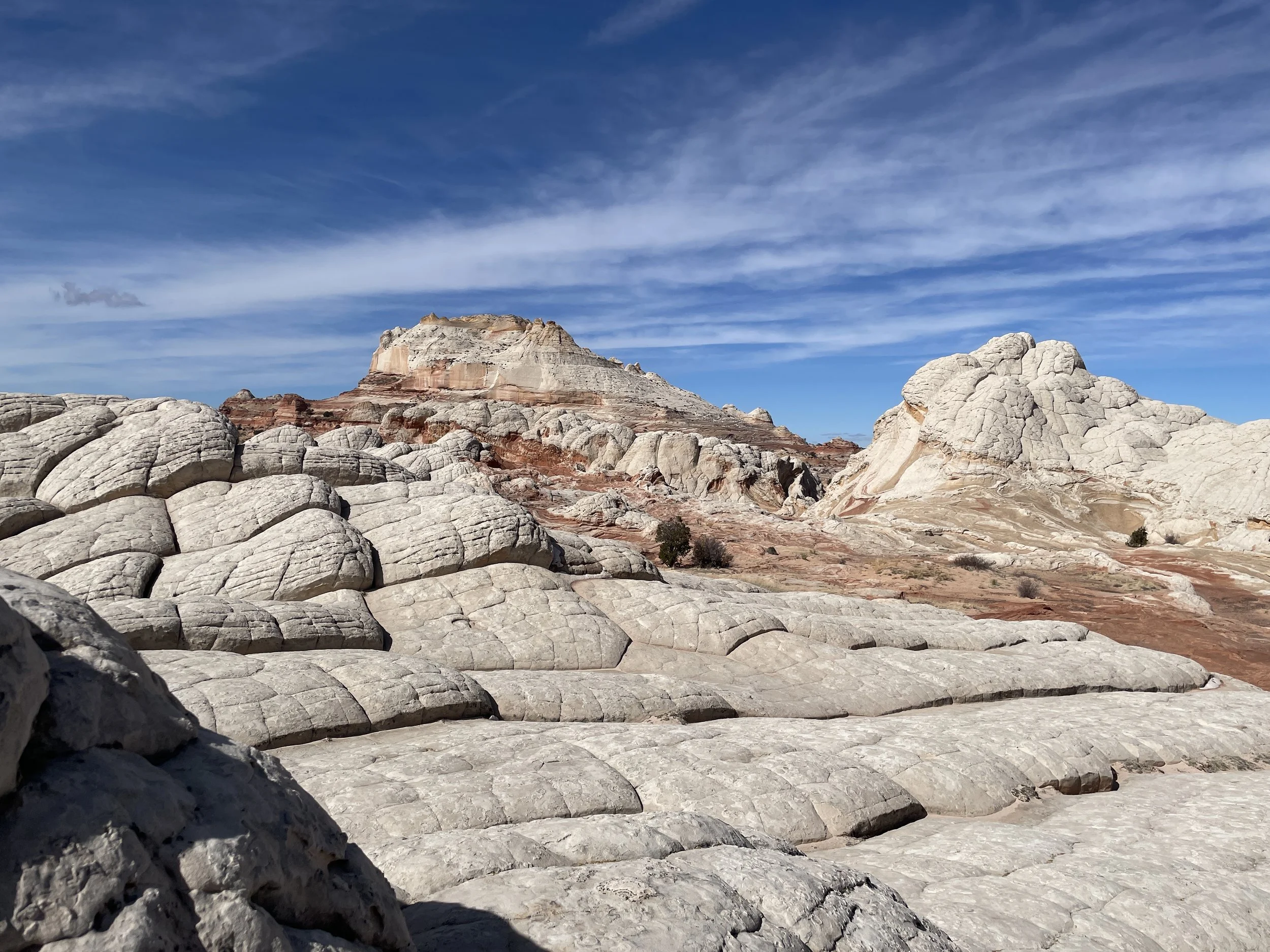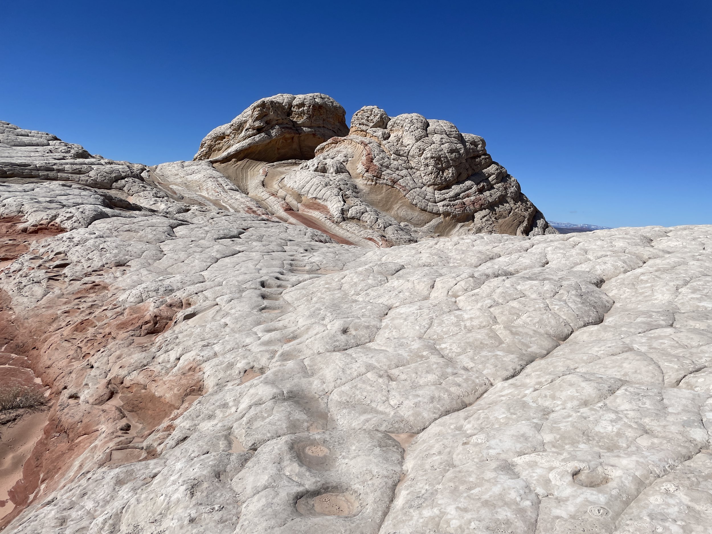 Geometric patterns in the rocks at White Pocket are similar to Zion’s Checkerboard Mesa and the Yant Flat Candy Cliffs