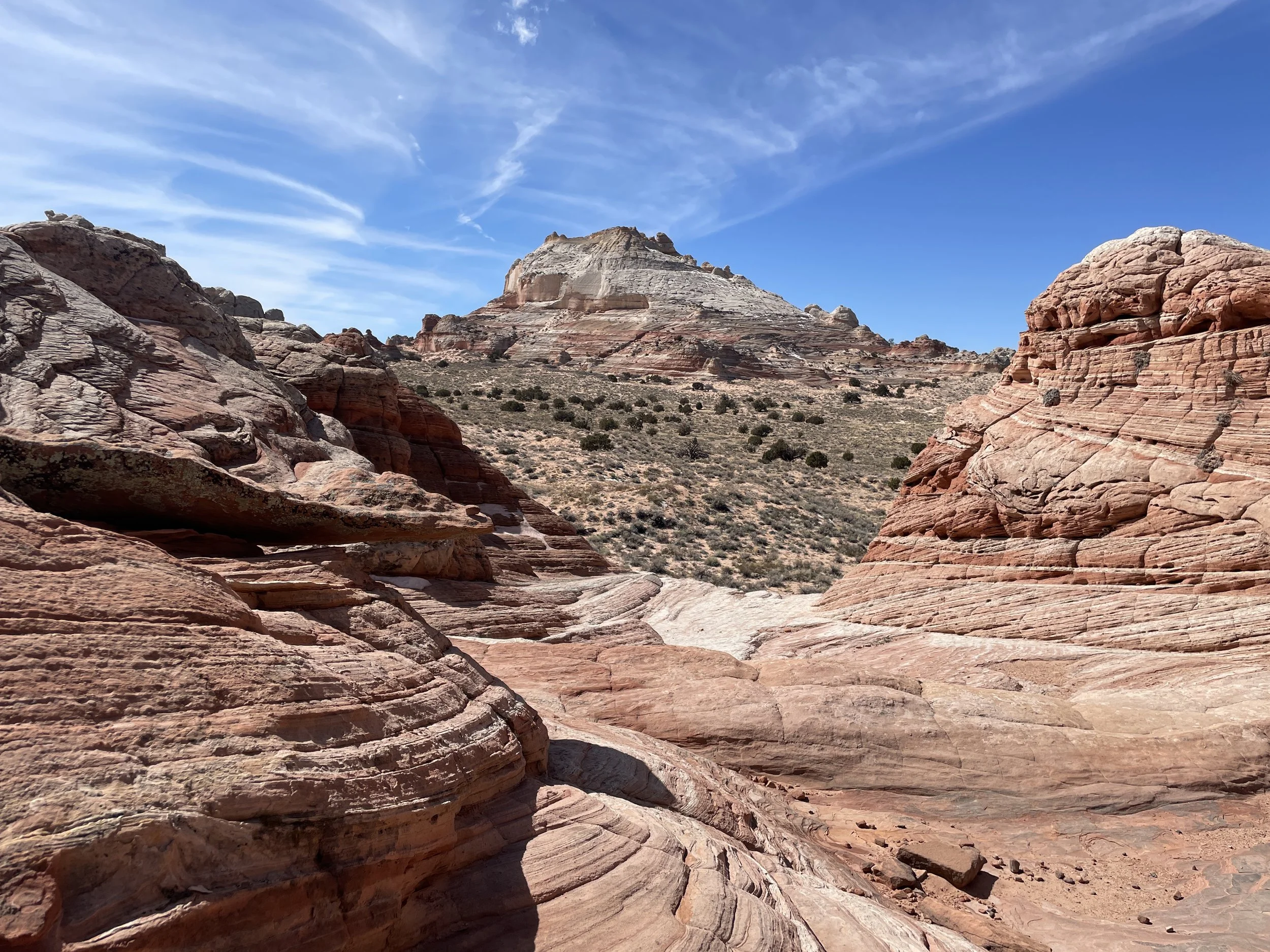 The good news about planning a trip to White Pocket - this is a free place to visit with no permits required. The bad news - White Pocket is really hard to get to. The closest cities with lodging are Kanab, Utah and Page, Arizona. Both cities are along US-89, each about 40 minutes from the turnoff. From US-89, first there is a 20.5-mile drive along a dirt road. This dirt road may be in various states. If it’s wet, it’s going to be impassable. If you are traveling too early in the spring and the BLM (Bureau of Land Management) hasn’t had a chance to re-grade it yet, good luck. It’s going to be filled with treacherous potholes. This is the same road you need to take to Buckskin Gulch. When we travelled it in June 2025, it was fine with our minivan. I wouldn’t have thought anything of it. Except in March 2023, this road was so hard to drive on that cars were parked on the edge in the desert landscape, and hikers were walking extra distances to get to the slot canyon trailhead. I give this dirt road a “wild-card” rating without a 4x4.