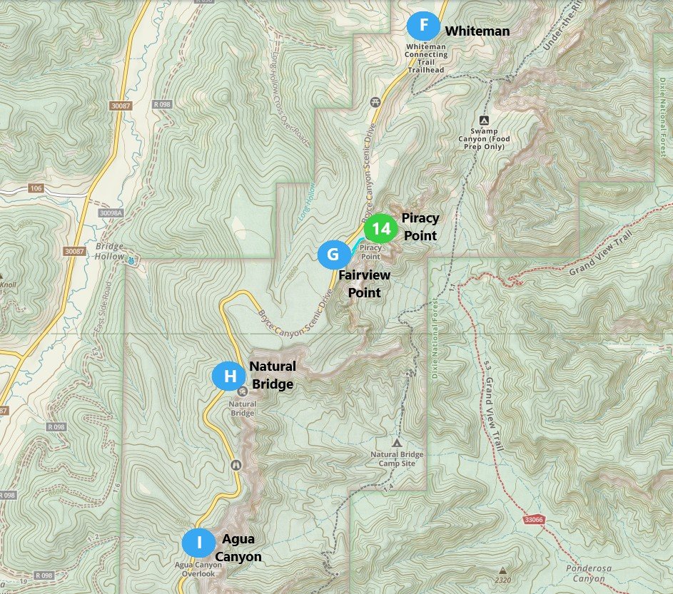 Viewpoints (blue): D - Fairyland Point, E - Swamp Canyon, F - Whiteman, G - Fairview Point, H - Natural Bridge, I - Agua Canyon, J - Ponderosa Canyon, K - Black Birch Canyon, L - Rainbow Point