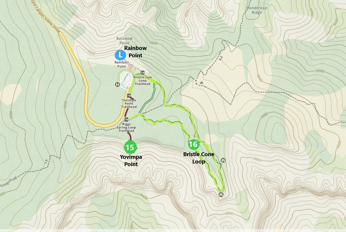 Map of Rainbow Point and the trails to Yovimpa Point and Bristle Cone Loop