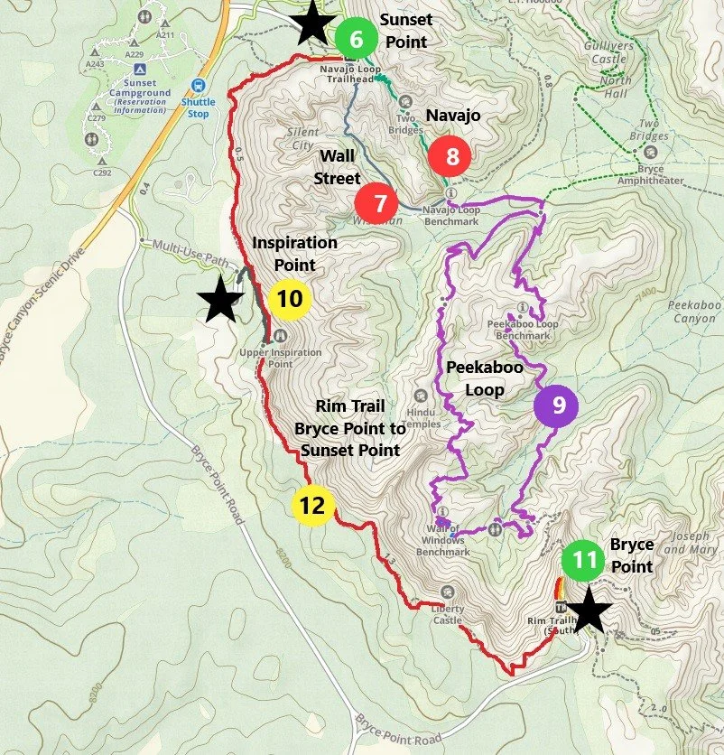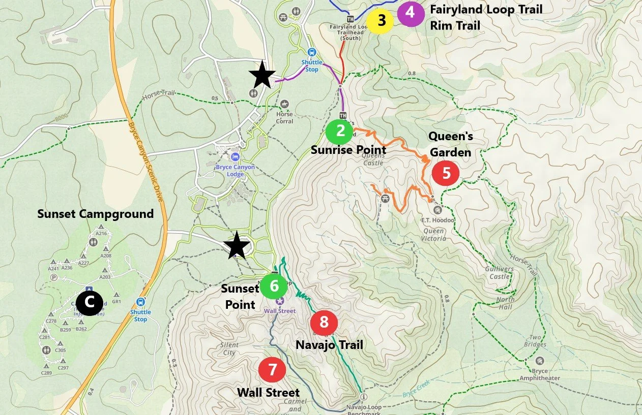Strenuous Trails (red): 5 - Queen’s Garden, 7 - Wall Street, 8 - Navajo