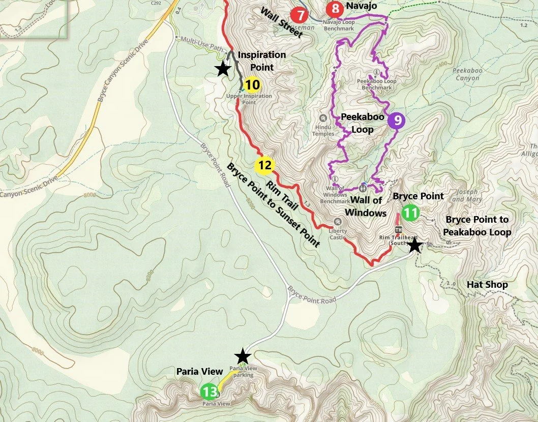 The Rim Trail (Sunrise Point to Fairyland Point) is part of the Fairyland Loop. It is marked in red.