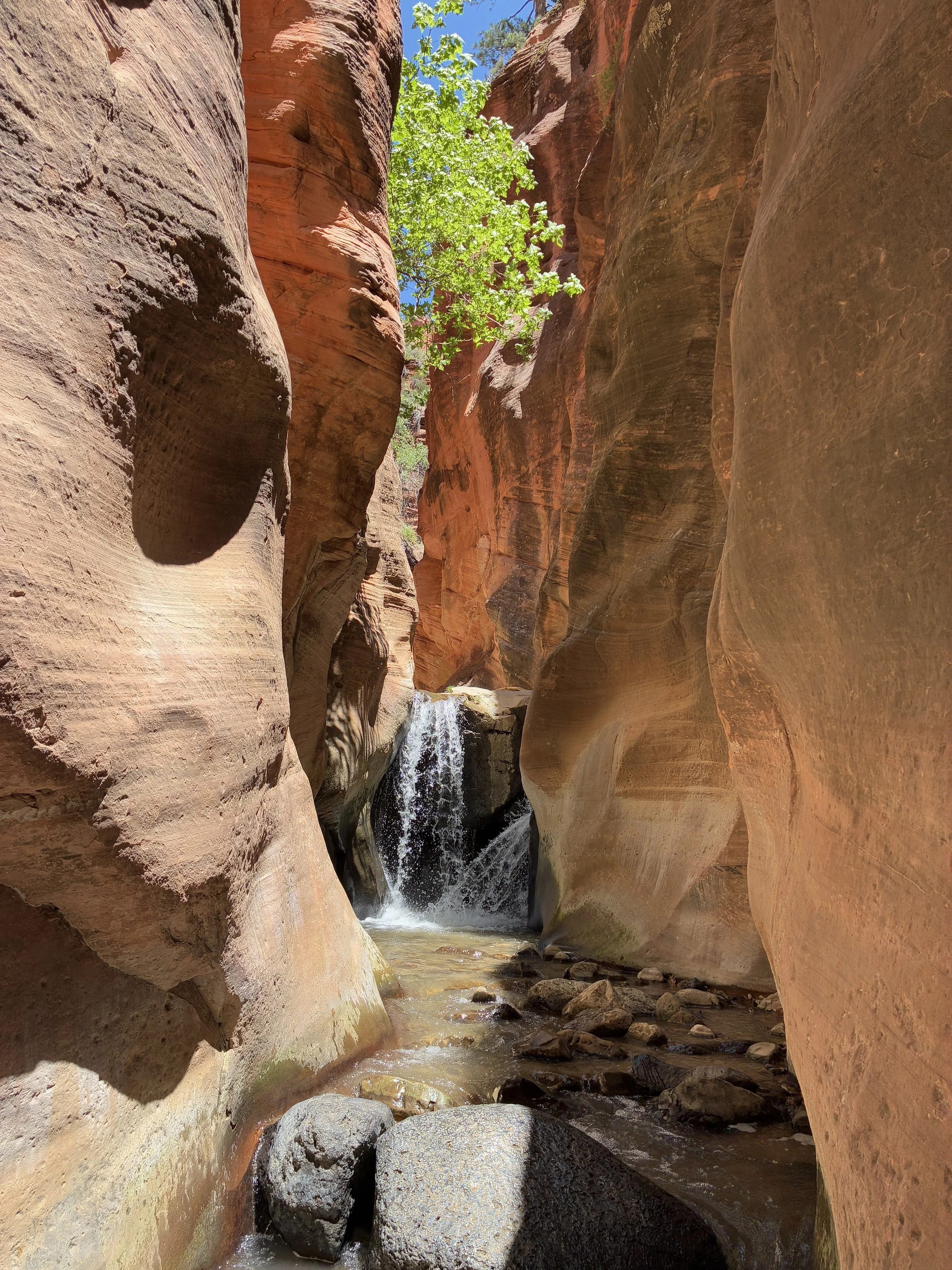From the beginning of the slot canyon to the first waterfall, it’s only 0.1 miles, so there are only a few turns in the canyon until the waterfall is visible. If there are people in front, just give them a few moments. They will take pictures and then head upstream, where they will be out of view. We found it pretty easy to space ourselves out and enjoy the peacefulness of this canyon.