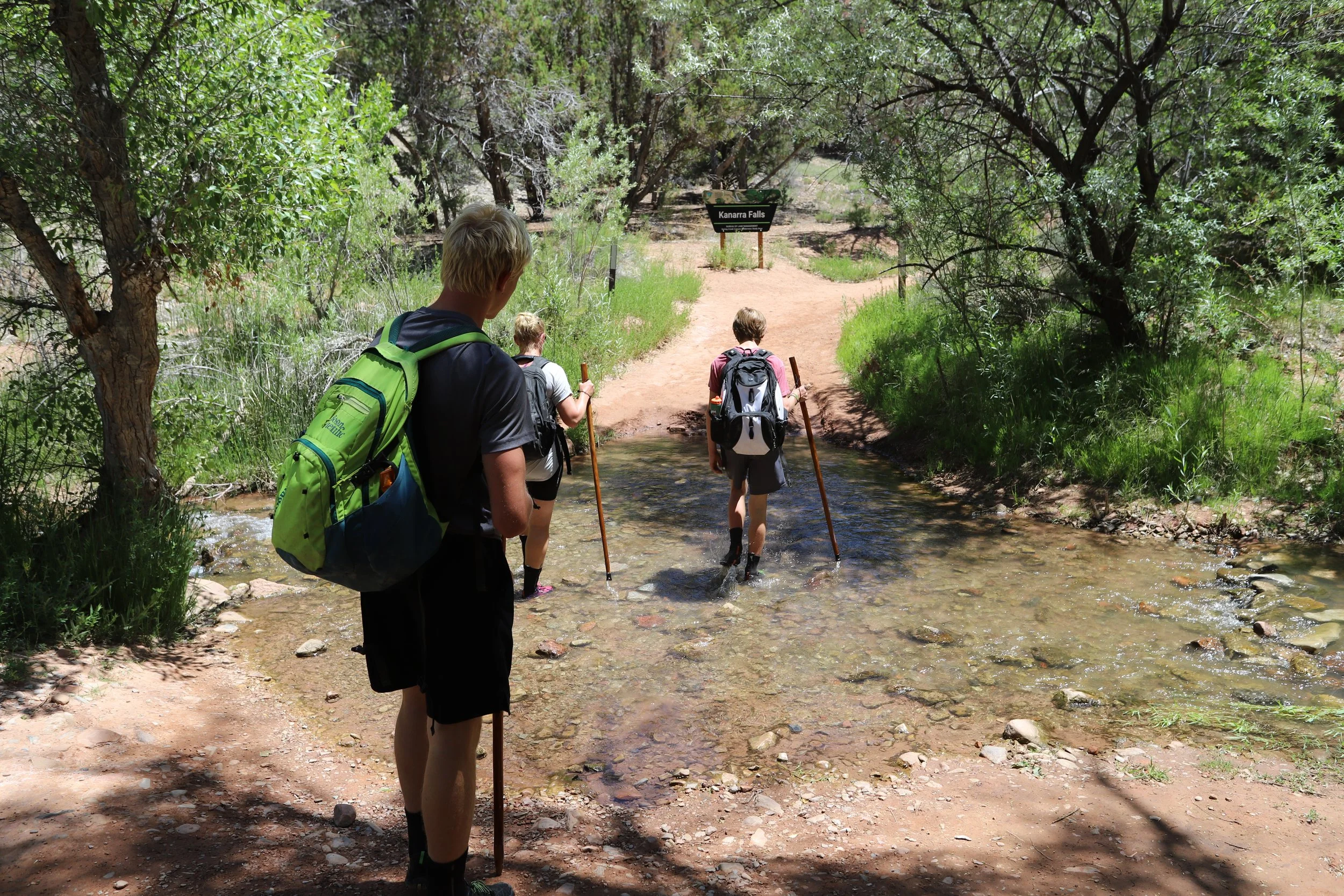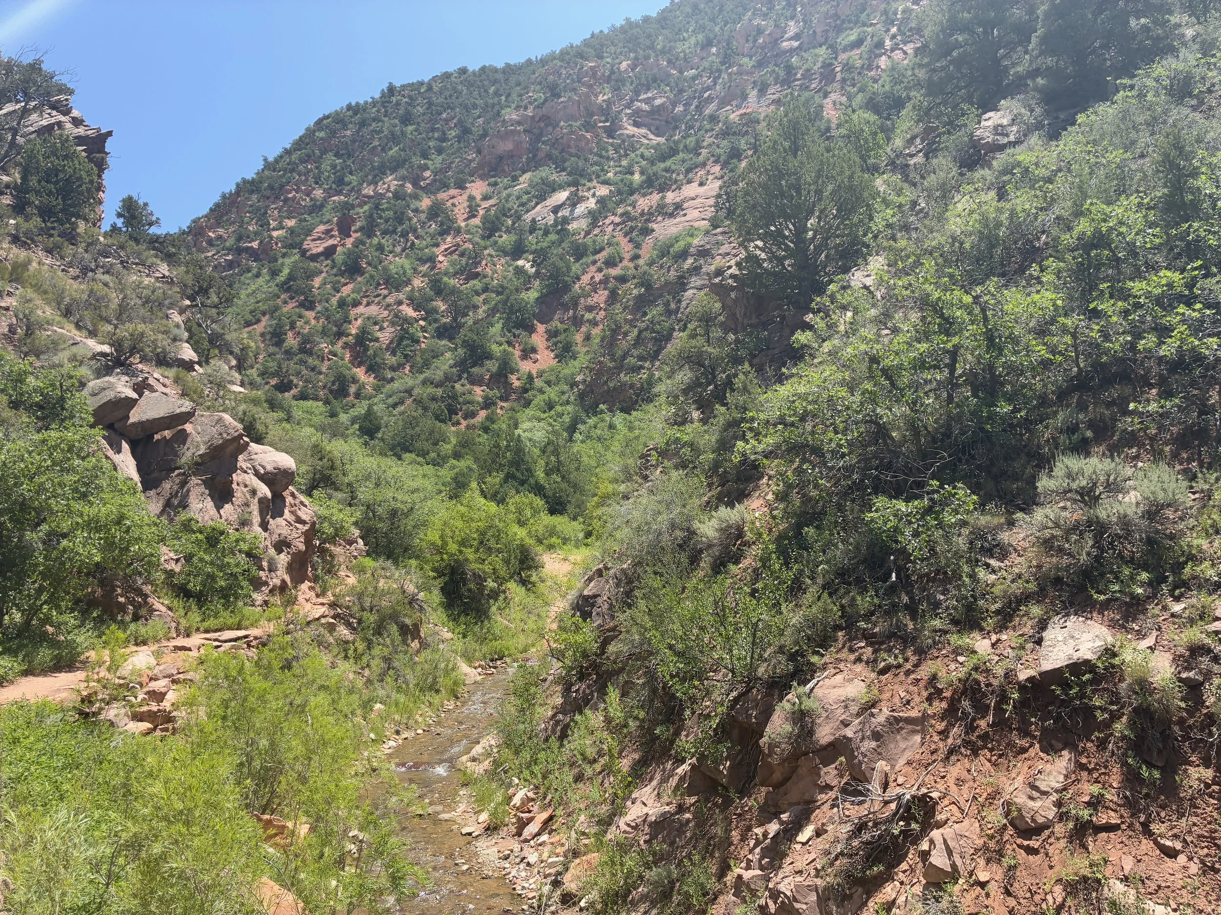 There is a barbed wire fence about a mile into the Kanarra Falls trail. Following this section, there is more shade and frequent creek crossings.