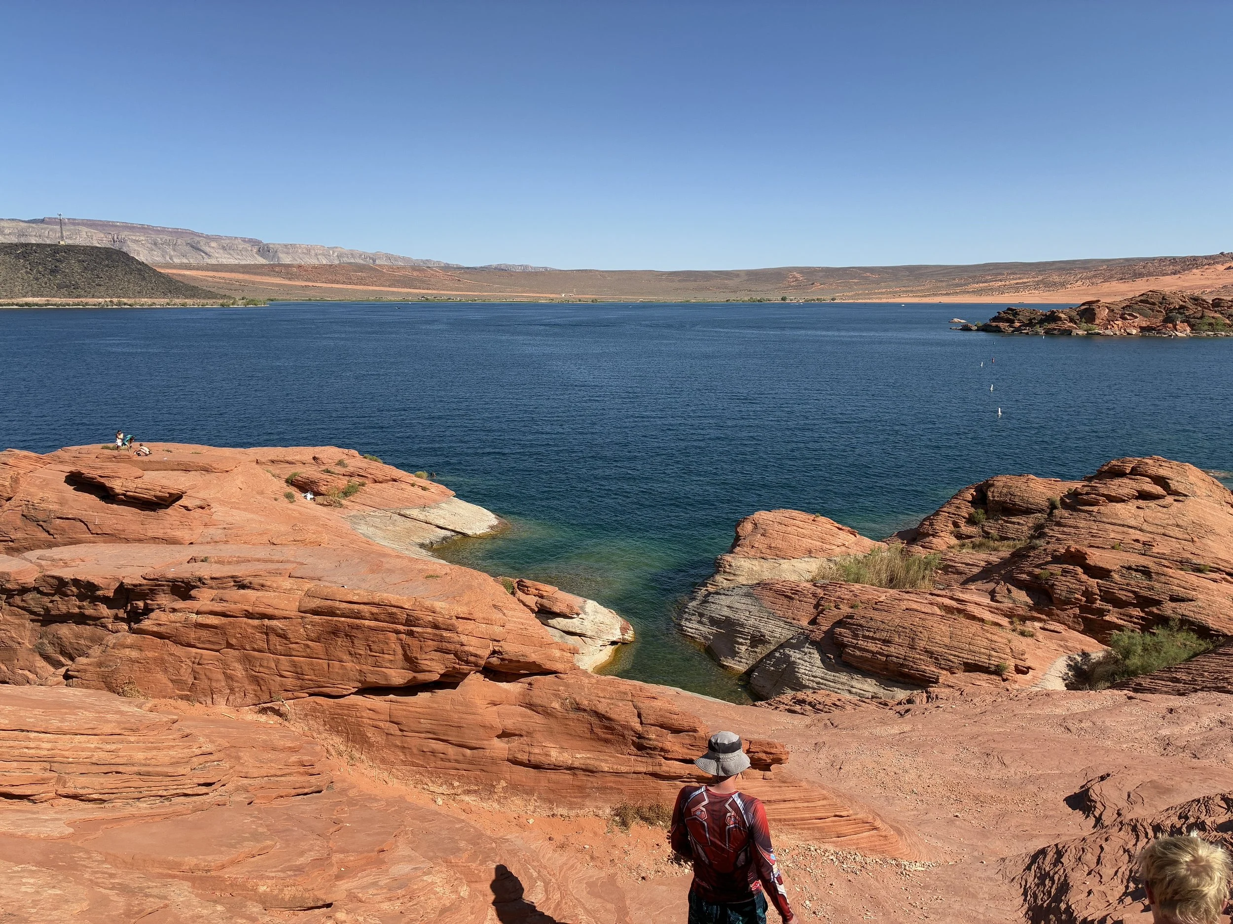 View of the Sand Hollow State Park reservoir on the way out to Jumping Rock (high red rock on the left)