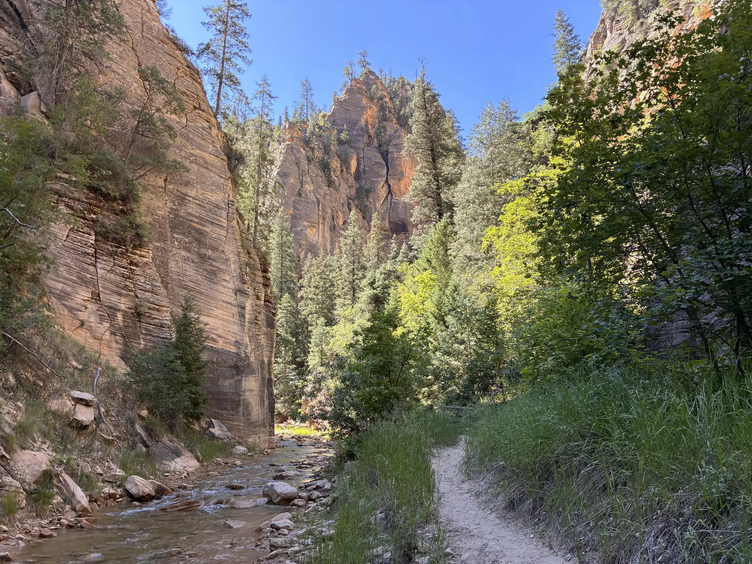The coolest part of this trail is how just a bend in the river changes the entire landscape. At this point, we can now start to see Zion’s deep oranges and reds in the canyon walls.