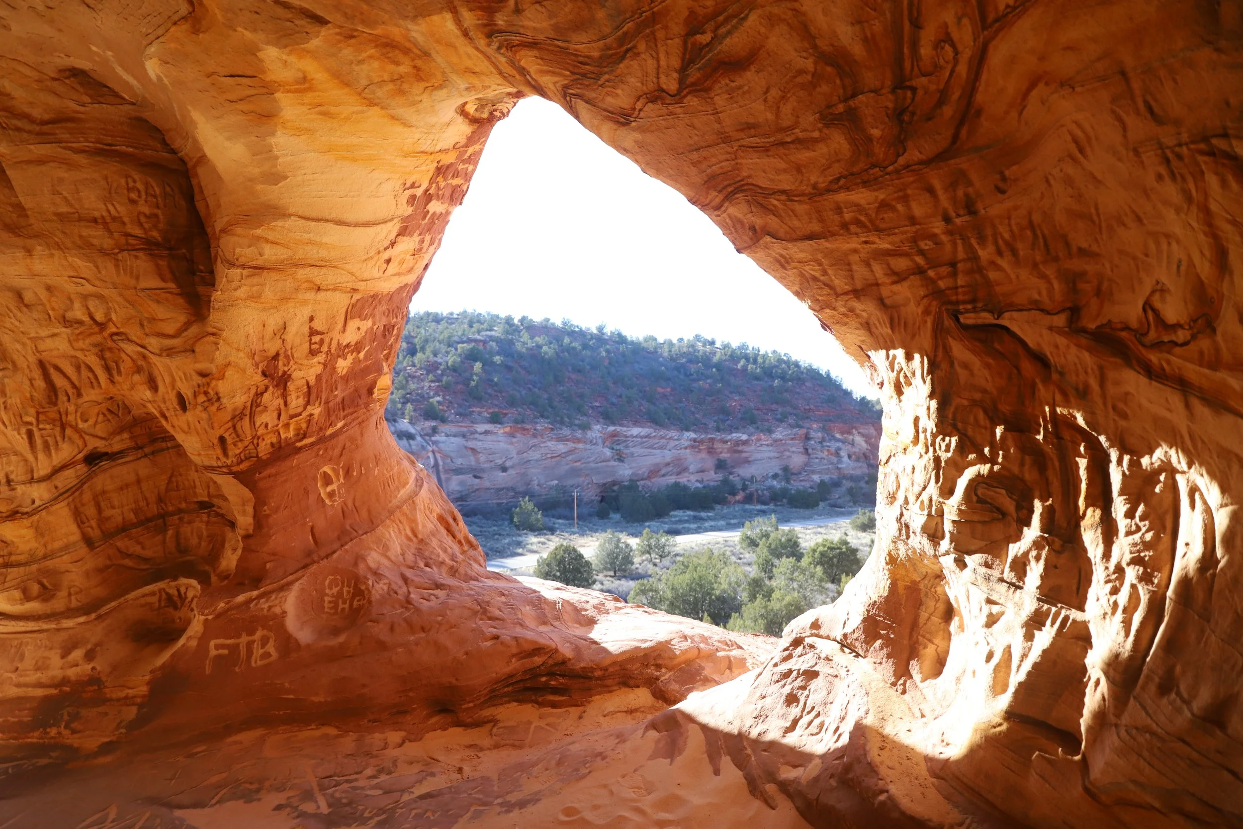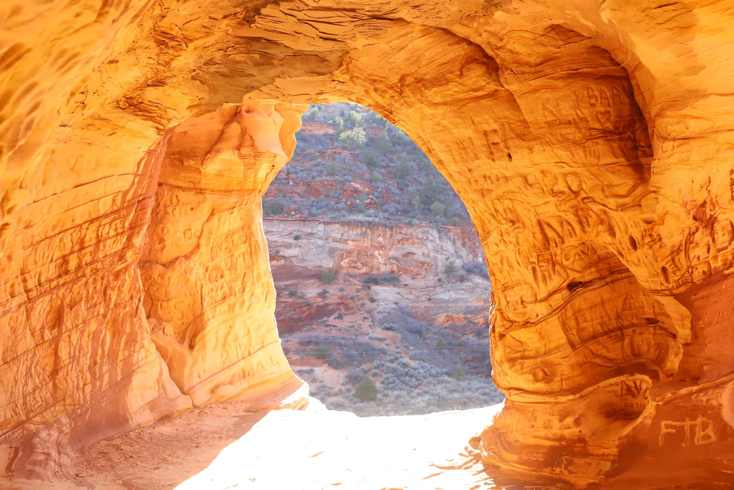There are a lot of cool things to do in and near Zion National Park. The Moqui Caverns are a quick activity (30-60 minutes) to tack onto a trek east of the National Park, like heading out to Coral Pink Sand Dunes, or a way to spend a short bit of time for anyone staying in Kanab, UT. I don’t know that I would say these caves are worth a special effort to get to though. This is one of the rare instances where I might say the pictures are better than the hike. There is a lot of graffiti in the caves, and the caverns are manmade instead of a natural feature. To be very honest, although I’m spending time writing up a blogpost, I would actually suggest spending any extra time in the east part of Zion National Park instead, where there aren’t crowds or formal trailheads, but you may find little waterfalls or petroglyphs if you explore into the canyon from any of the pullouts. I guess I’m trying to say that if / when (I’ve been to Zion six times, so I’m assuming I’ll be back again), I head to Zion again, I’d rather go back and explore further into the eastern part of Zion than return to these sand caves, if that advice is worth anything.