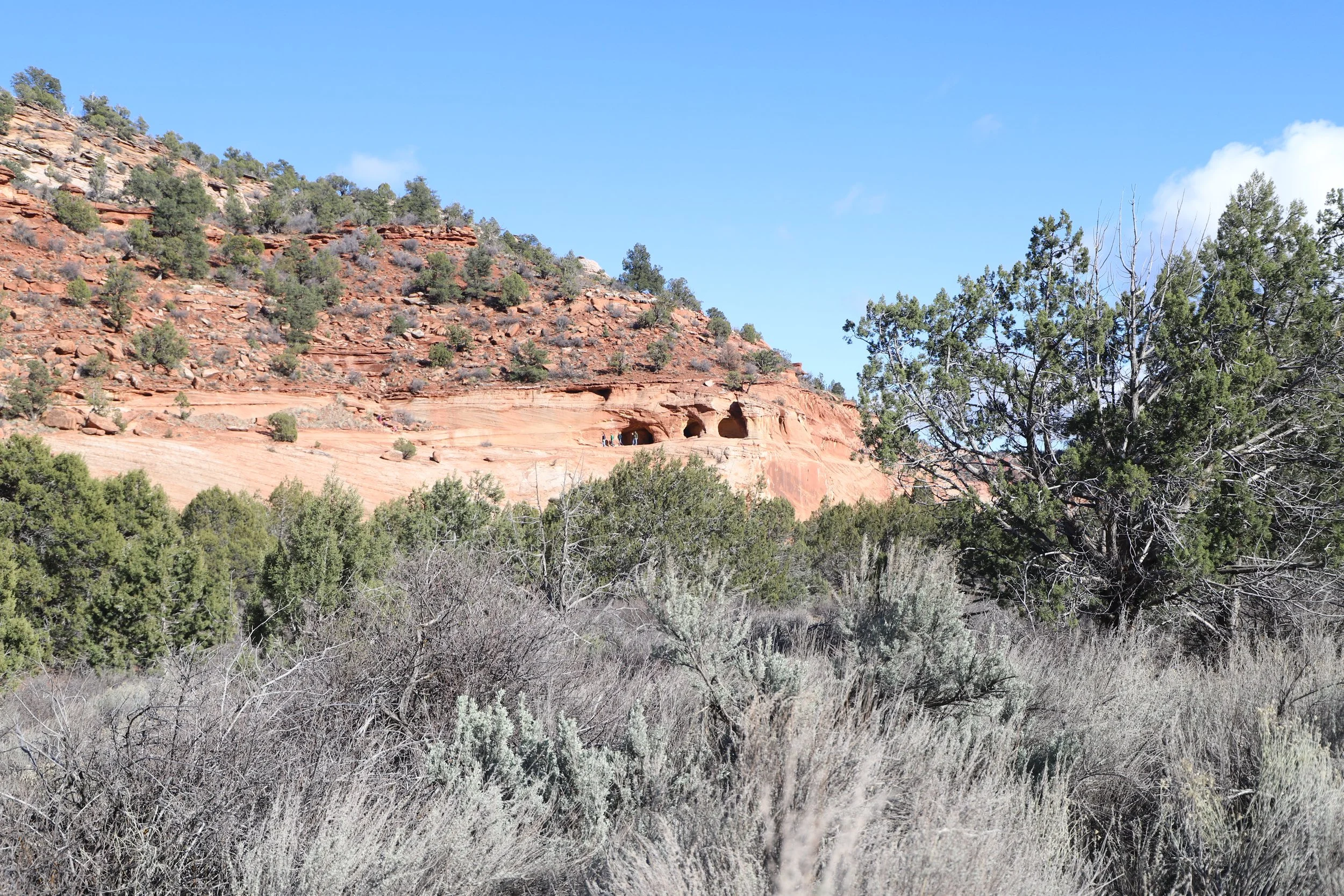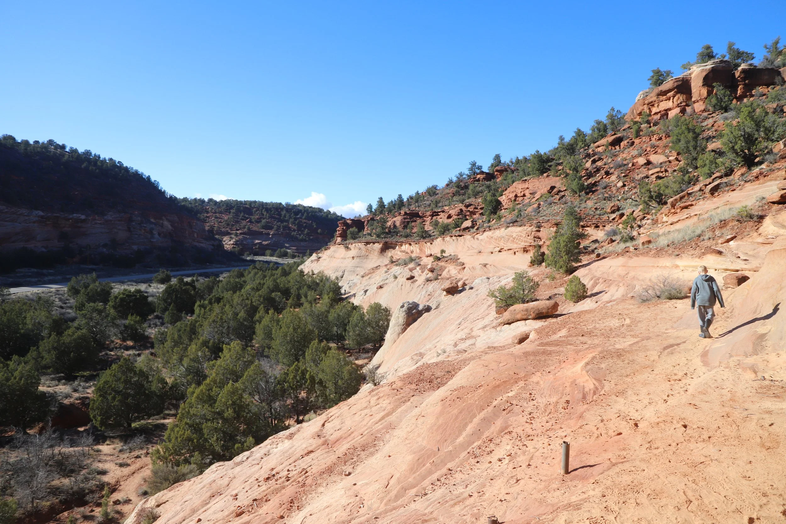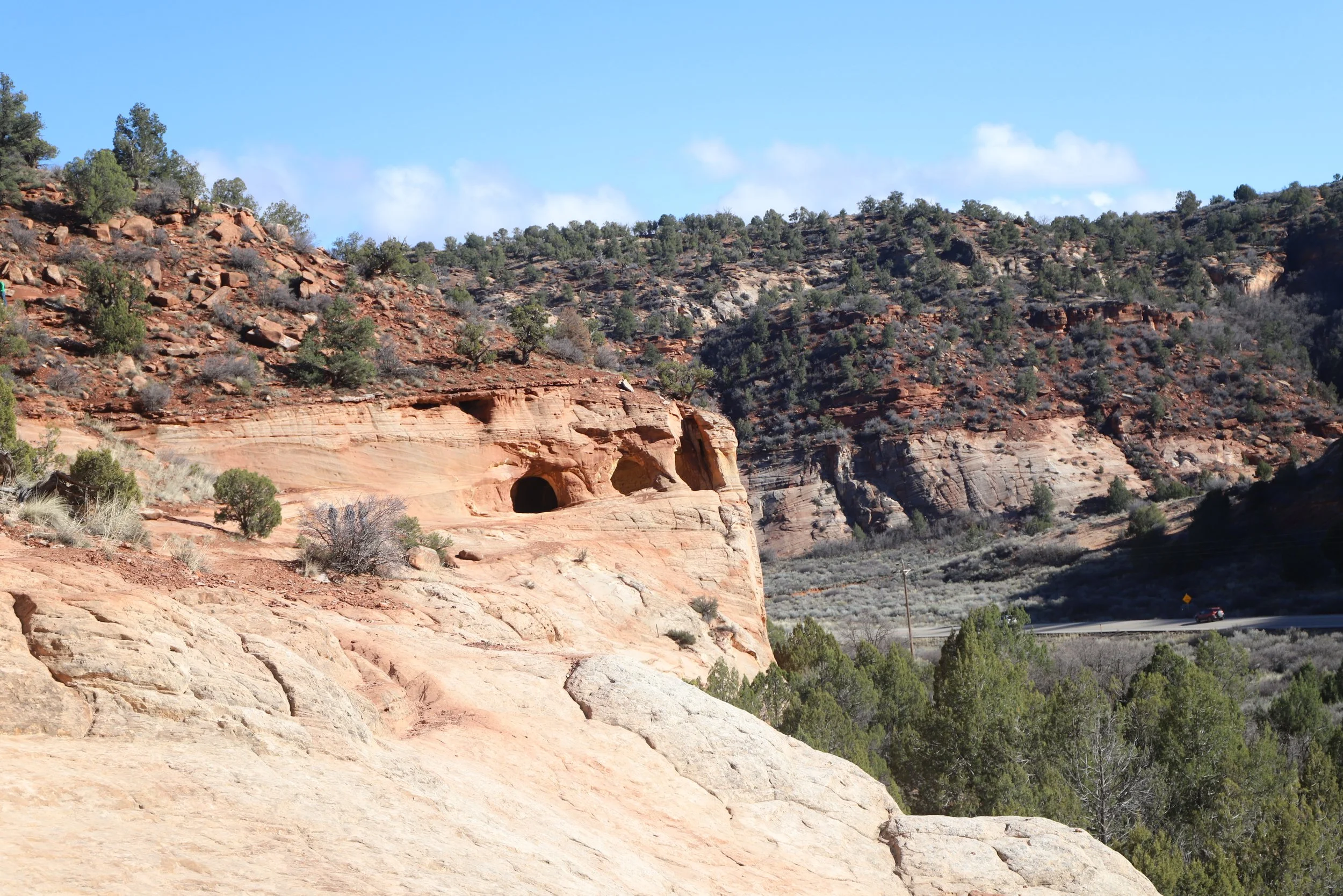 There is a short (<0.5 mile walk) to get to the bottom of the cavern entrance. There is no formal “trail” up the sandstone to get to the entrance. It’s more of a rock scramble in whichever manner you may feel is the safest… This picture below shows US-89 off on the left, and the sandstone cliff that must be scaled up in order to get into the caverns. I wasn’t super thrilled at how sketchy this hike up (and down) felt.
