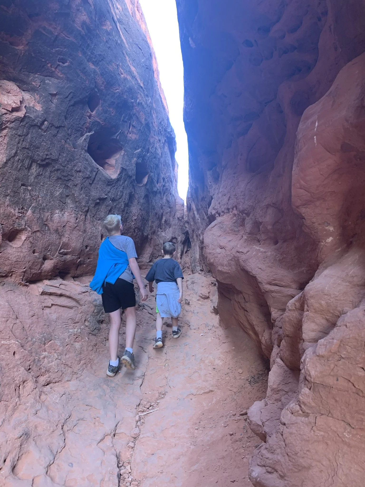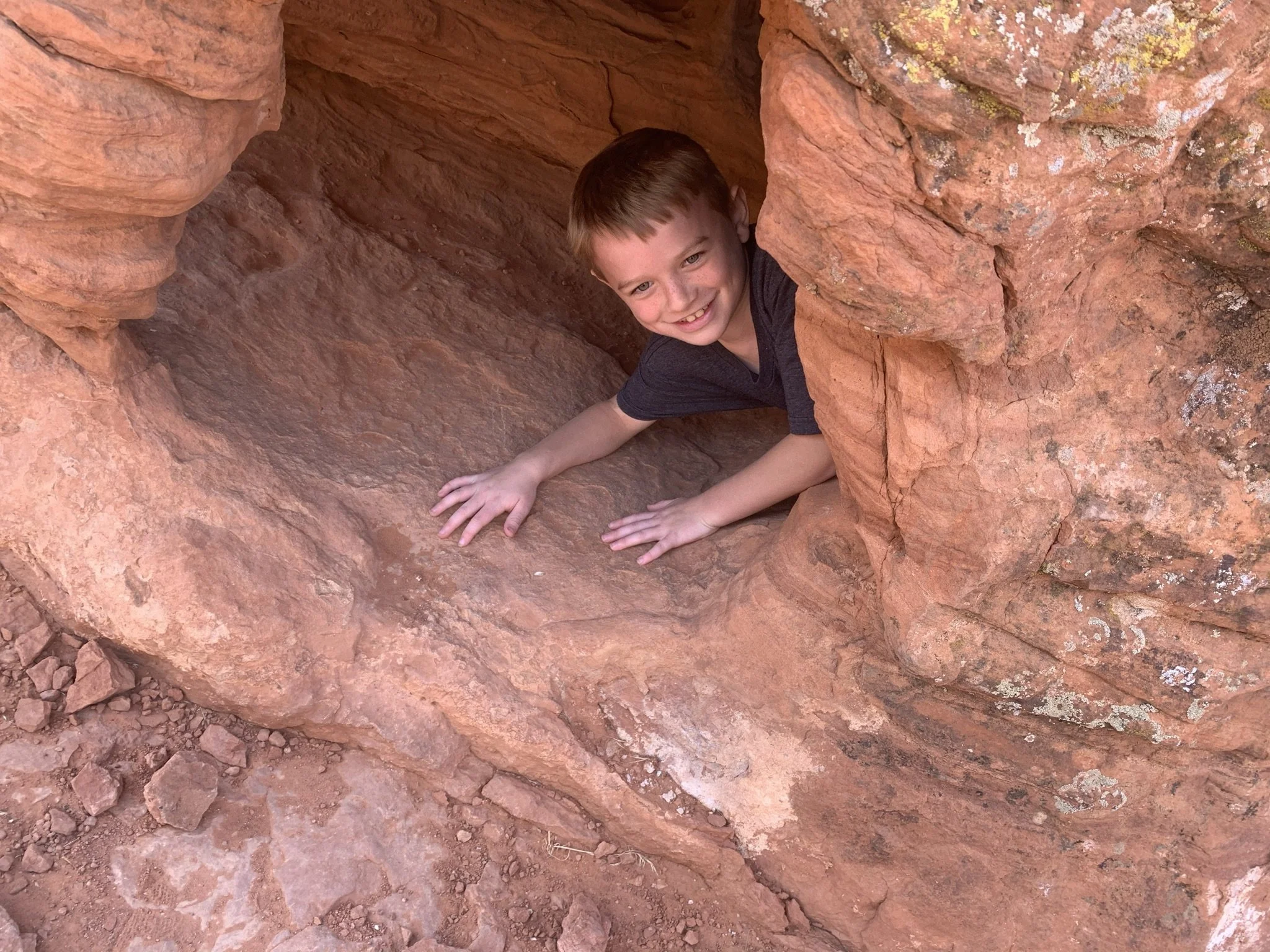 Inside, it’s a tight squeeze. Feet can fit in a forward direction the whole time, and my head had space to turn, so not the narrowest slot canyon that I’ve been in, but still, this is a dramatically small space to take a hike through. This was the boys favorite part of Pioneer Park.