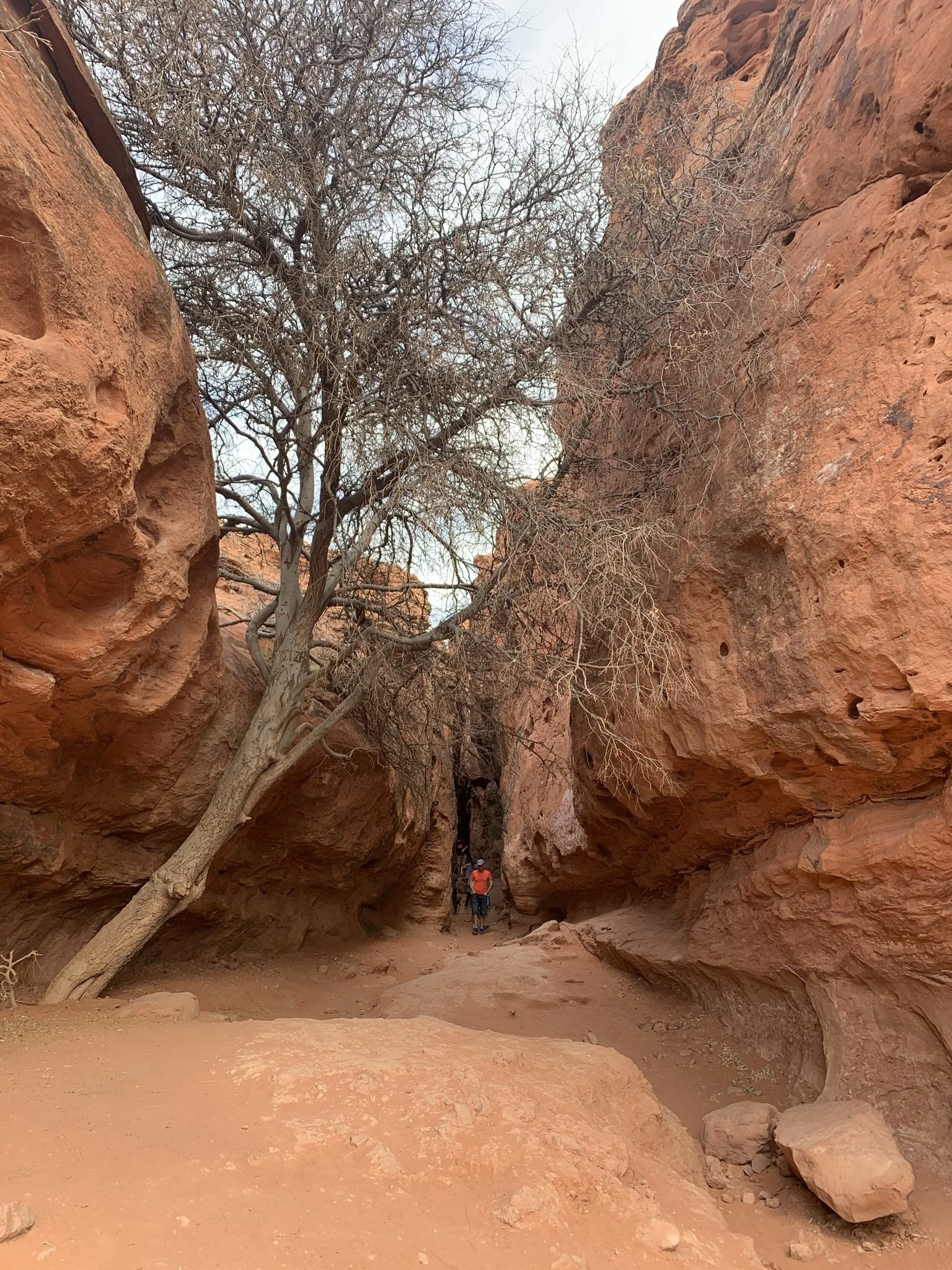 If you are at the arch, walk west. You will come to the crack from on top of the rocks. This slot canyon is a tight squeeze. It’s possible to go in either direction through the canyon, but in reality, you are going to go the same direction that everyone else goes… as you won’t be able to pass each other inside of the canyon. Just pay attention to how people are getting through it and walk towards that end of the canyon where people are lined up. We entered from the north side and walked south.