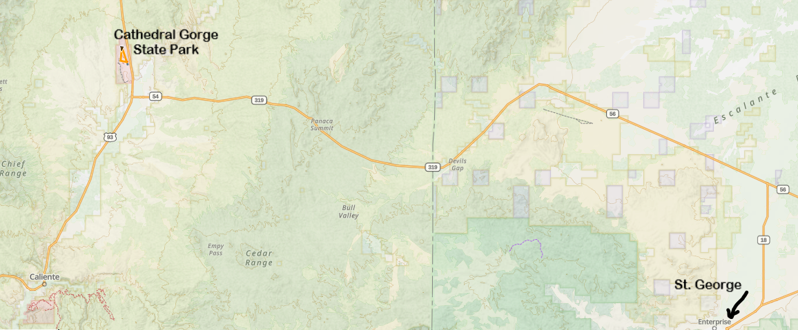 Cathedral Gorge State Park is not quite two hours from St. George. This is a long day excursion, but there really isn’t really a closer city. The one other thing that could be combined with a day trip out to Cathedral Gorge from St. George is Snow Canyon State Park. The road to Cathedral Gorge goes past Snow Canyon. If you intend to hike much at either park though, you might choose to split it into two days.