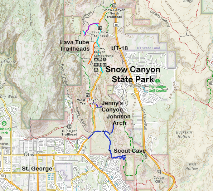 Snow Canyon State Park is on the northwest side of St. George. The city runs right up to the edge of the park. Snow Canyon is located just off of UT-18. Note that this is the same highway (UT-18) that is used to get to Nevada’s Cathedral Gorge State Park. I have a link to this park at the end of my post, due to its further driving distance. These parks could be combined on the same day, although it’s going to be a long day, and you probably can’t hike every trail at both parks.