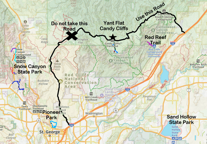 From St. George, on a map, it looks like there is a way to get to the trailhead in 40 minutes. I’ve been on this road twice. The first time, I was in a rental truck and almost got stuck in the mud. We turned around and didn’t make it. The second time was in our personal minivan, and we were driving from the trailhead to Olive Garden in St. George. It looked faster than the drive in from Leeds. I figured my first experience was just due to it being winter. It was not better… We did not pop a tire, but my husband and I were both shocked that we didn’t. Use the road in and out from Leeds. It was in much better condition. It’s just 10 minutes longer.